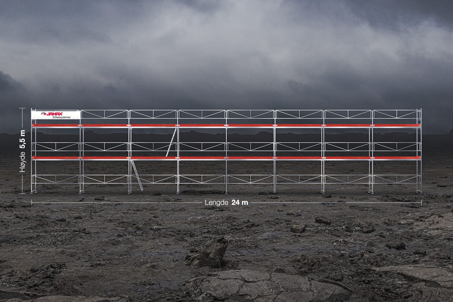 Dette er den nest største av våre fire Byggmesterpakker. Den har en lengde på 24 meter i to etasjer. Stillaset kan også bygges kortere og høyere ved hjelp av få tilleggsdeler eller endringer i pakken.