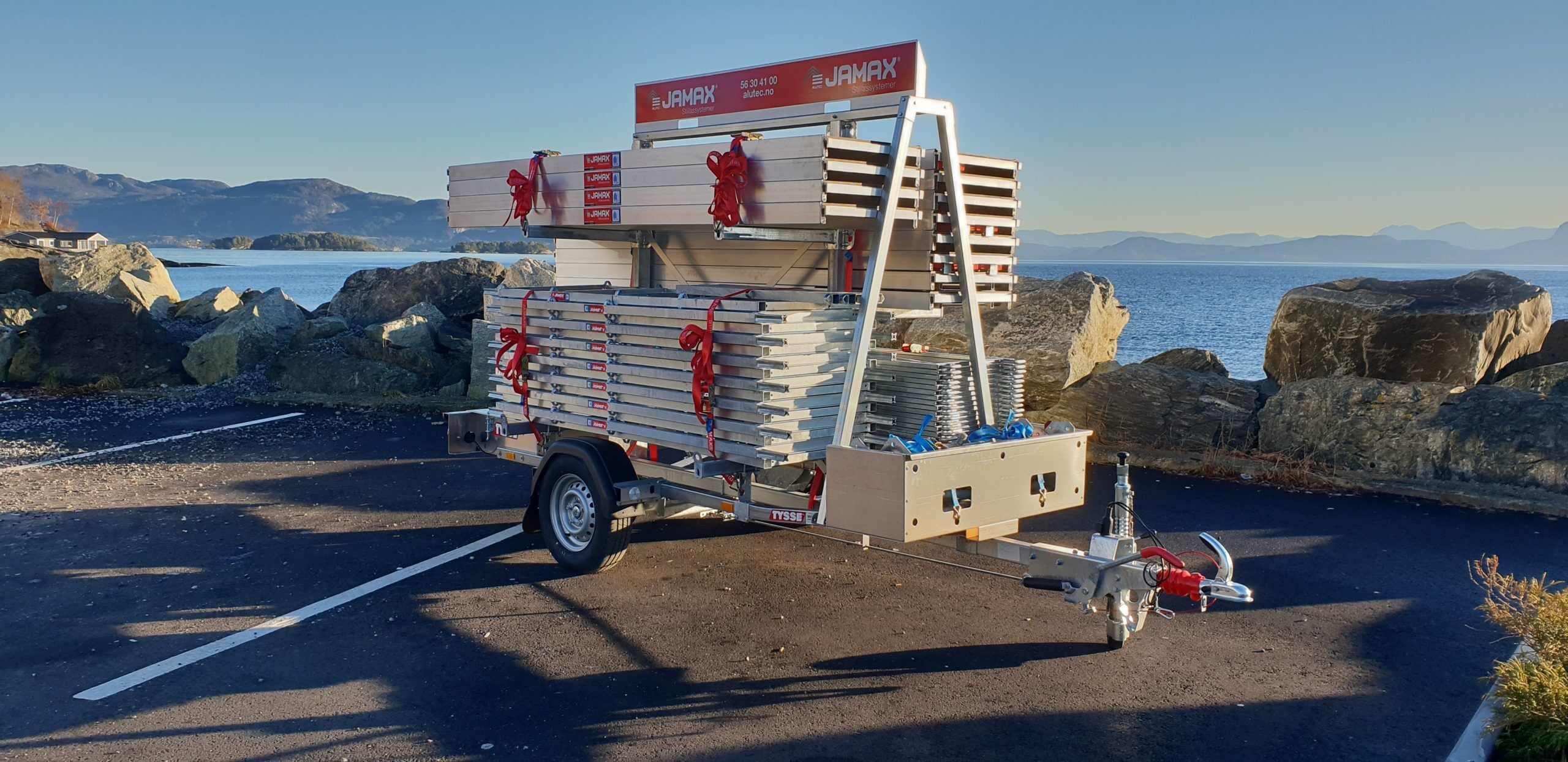 Dette er den nest største av våre tre Tilhengerpakker. Pakken består av en Jamax Byggmesterpakke 99 m2 ferdig pakket på en Tysse stillashenger, modell 6265.
